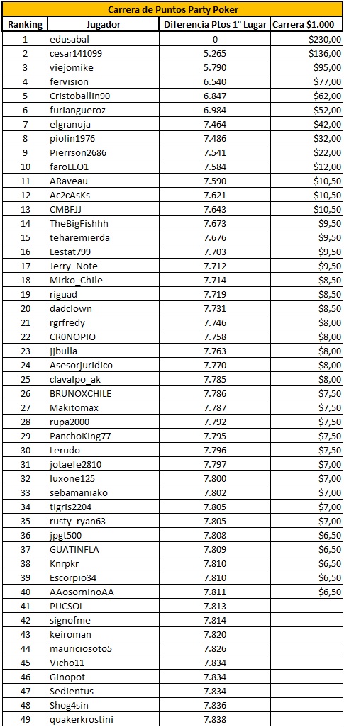 Este el sexto informe de la carrera de puntos, “Edusabal” se mantiene firme en el primer puesto. A continuación el ranking completo: